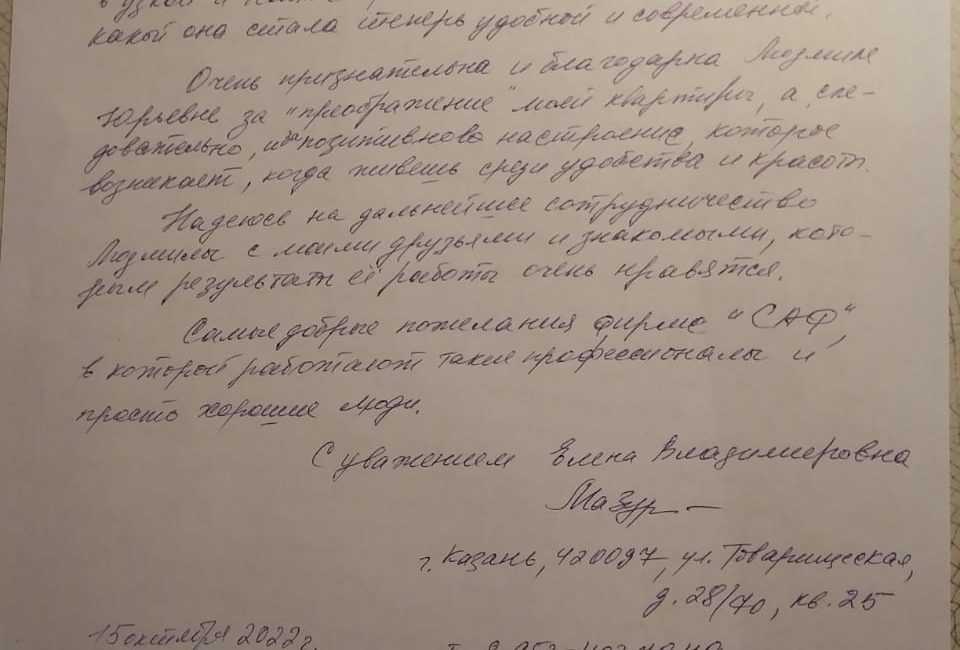 Хочу поблагодарить вашу сотрудницу, Людмилу Юрьевну Абрамову, за внимание, отзывчивость и терпение в работе с заказчиками. Мне уже много лет — 72 года, и я понимаю, что работать с таким «контингентом» сложно. Я не владею компьютером, с пространственным воображением тоже слабовато. И, придя в торговую точку в магазине «Меггамебель» на Компрессорном в салон «САФ», я плохо представляла, как справиться с задачей: заказать мебель для крохотной «хрущевской» кухни и прихожей. Зашла в самый первый на этаже «Мегги» отсек, где были выставлены образцы кухонь. И не пожалела! С удивительным пониманием вопроса отнеслась ко мне менеджер-дизайнер Л.Ю. Абрамова. Расспросила обо всём, что необходимо для удобства пользования мебелью на кухне, учитывая все параметры — даже мой рост — 146 см! Дала совет в выборе правильного подбора цвета самой мебели и столешниц, удобного расположения мойки и рабочей поверхности. Умудрилась «вписать» в маленькое помещение шкафчики, о которых я даже не мечтала. И в результате до миллиметра использовала всю возможную площадь […]